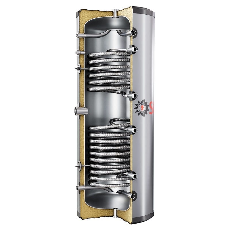 Напольный бойлер косвенного нагрева SILA SSL-300-D PREMIUM (бак аккумулятор) объемом 300 литров из качественной нержавеющей стали SUS316L с двумя теплообменниками увеличенного диаметра, площадью 3.73м2, предназначен для нагрева, аккумулирования и последующего использования горячей воды для отопления и горячего водоснабжения вашего дома. Использование в системе бака аккумулятора SILA SSL-300-D значительно увеличивает ее ЭФФЕКТИВНОСТЬ и БЕЗОПАСНОСТЬ, предотвращая закипание и прочие неприятности. Эффективная работа твердотопливного котла или теплового насоса без бака аккумулятора – НЕВОЗМОЖНА, КПД системы снижается в разы, тепло в прямом смысле этого слова вылетает в трубу.
